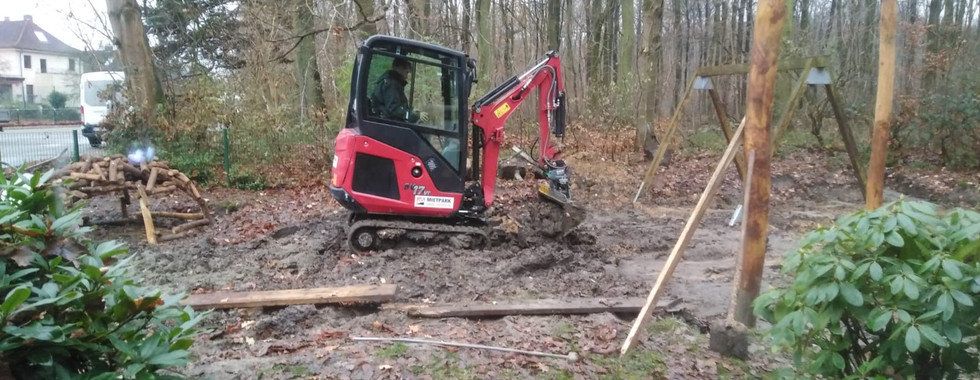 Seit dieser Woche sind die Profis am Werk. Die Firma Spielbetrieb Blankert und Obermann haben mir der Installation der Spielgeräte begonnen. Die Nestschaukel ist bereits an ihren neuen Standort positioniert, die ersten Pfosten für das Klettergerüst sind aufgestellt und die Bierberburg nimmt ebenfalls Form an.