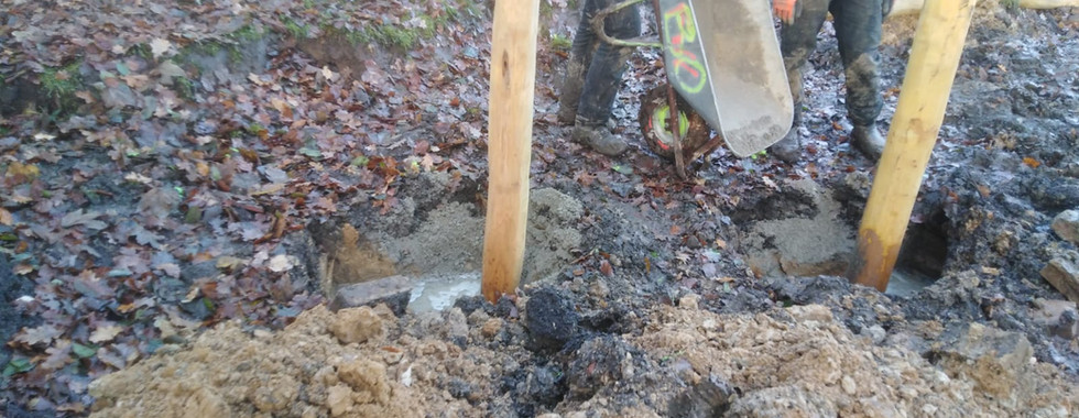 Leider hat der Regen der letzten Wochen den Boden extrem aufgeweicht, was die Arbeiten sehr schwierig macht. Nicht nur der Bagger versinkt im Schlamm, auch betongefüllten Schubkarren lassen sich kaum über das Gelände bewegen.